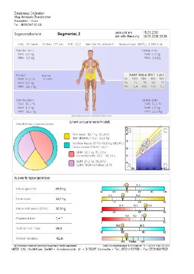 BIA-Messung (Messung der Körperzusammensetzung): Diese Messung ist eine Unterstützung und Motivation bei der Gewichtsreduktion. Weiters gibt es Sportlern und interssierten Menschen Auskunft über den Körpermuskel- und Körperfettanteil, den Wassergehalt des Körpers, den genauen Energiebedarf und auch darüber wo Muskeln und Fett sitzen. Informieren Sie sich bitte über die Messvoraussetzungen bei der telefonischen Anmeldung.